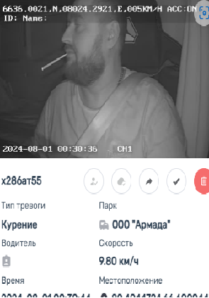 Камера контролирует нарушения в поведении водителя ( Засыпание / Усталость / Курение / Отвлечение внимания / Использование телефона/ Ремень безопасности / Питье)